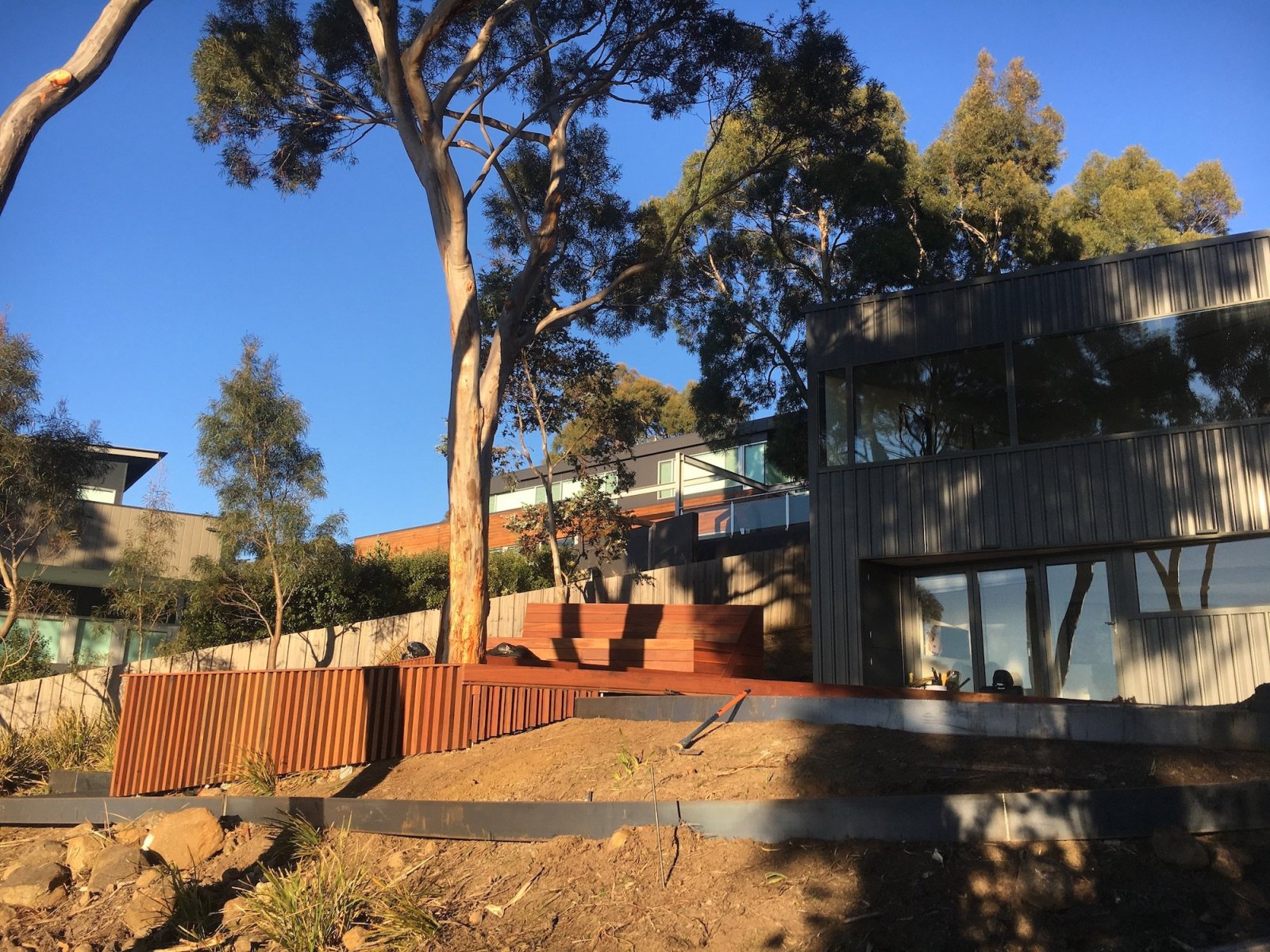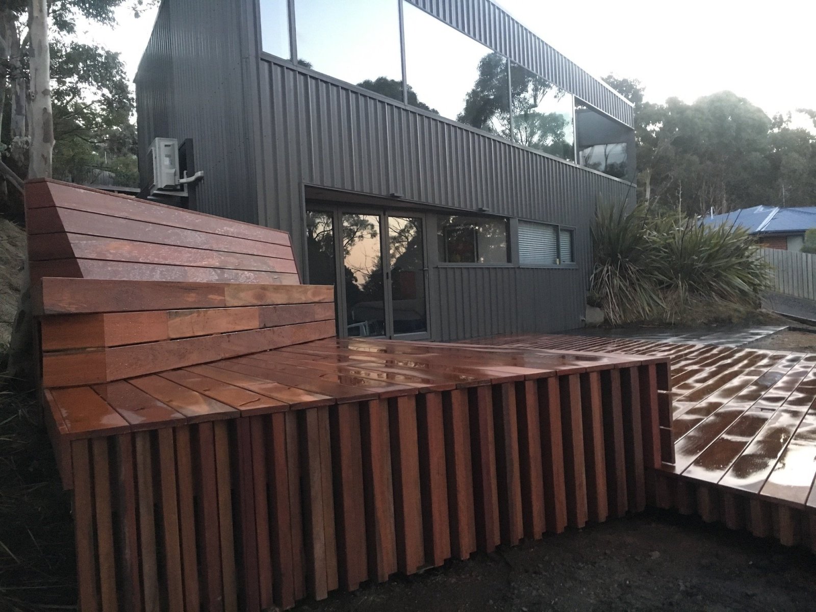 Converging lines and sharp angles project out from this contemporary home towards an extraordinary view of the Derwent estuary.