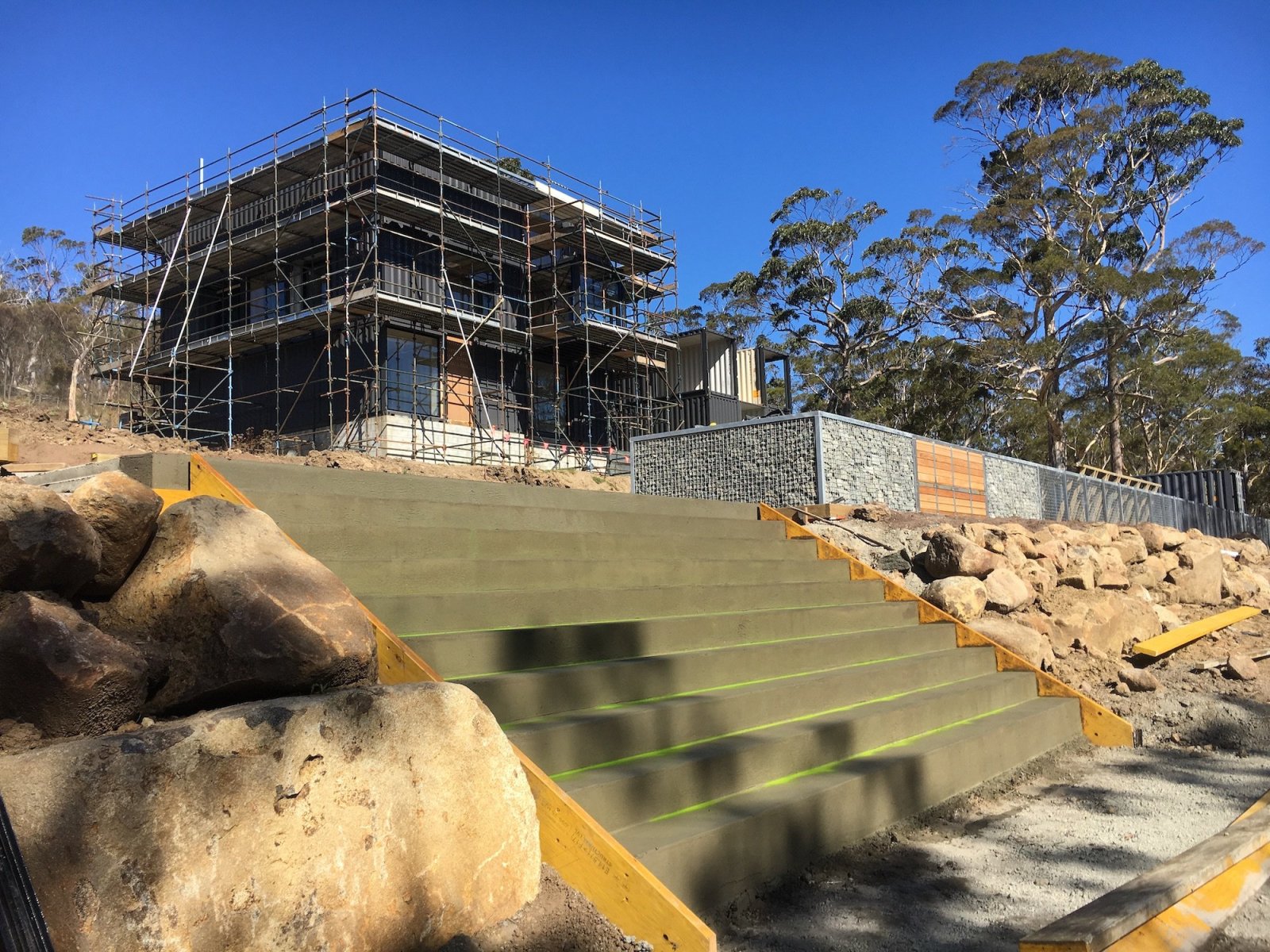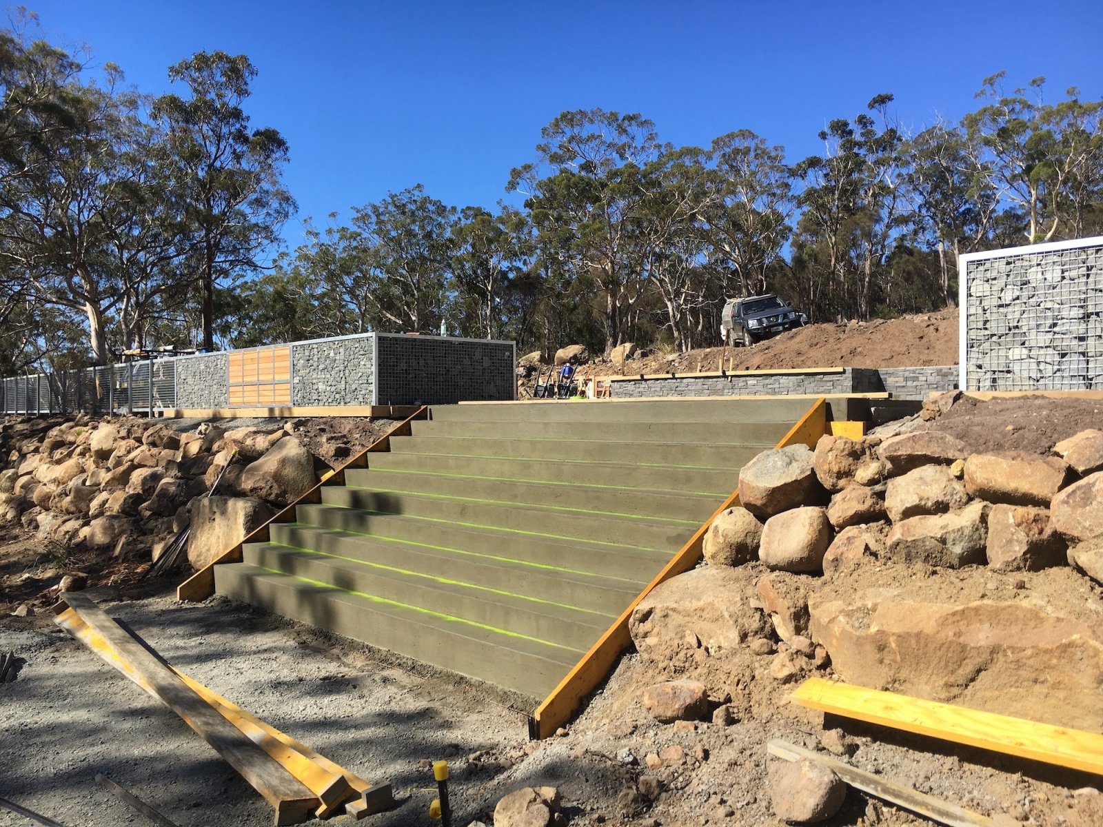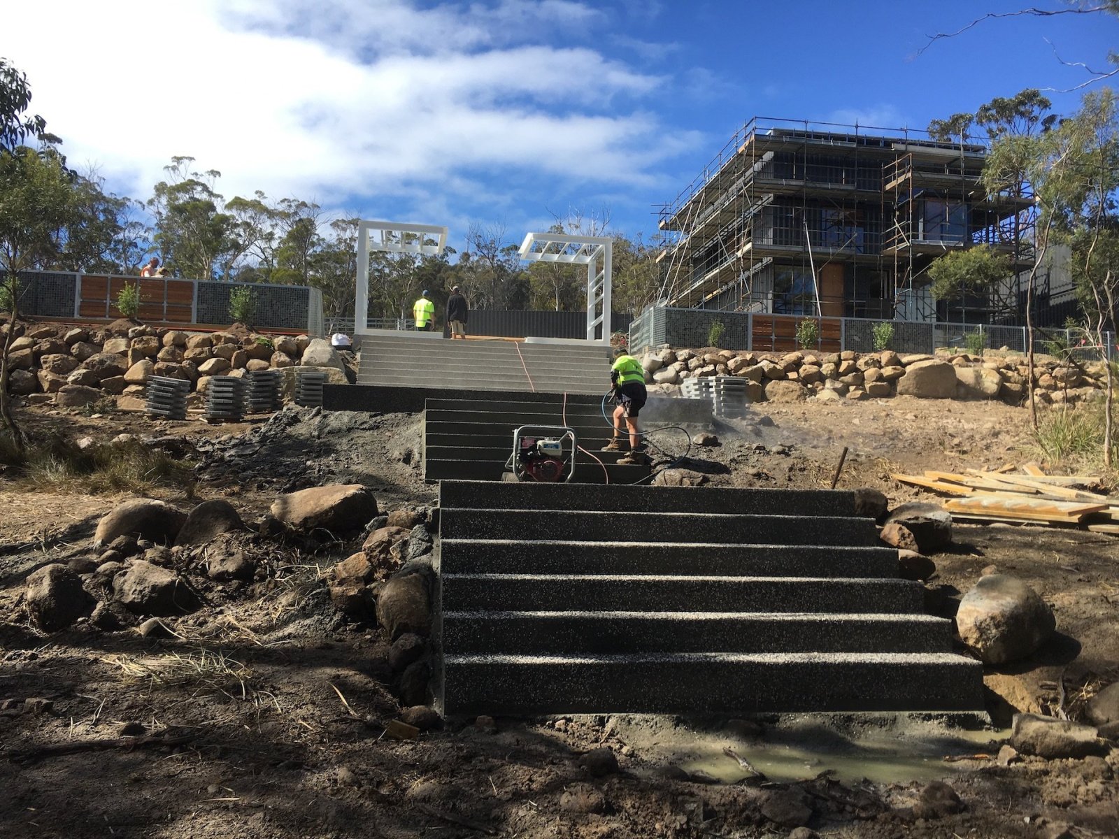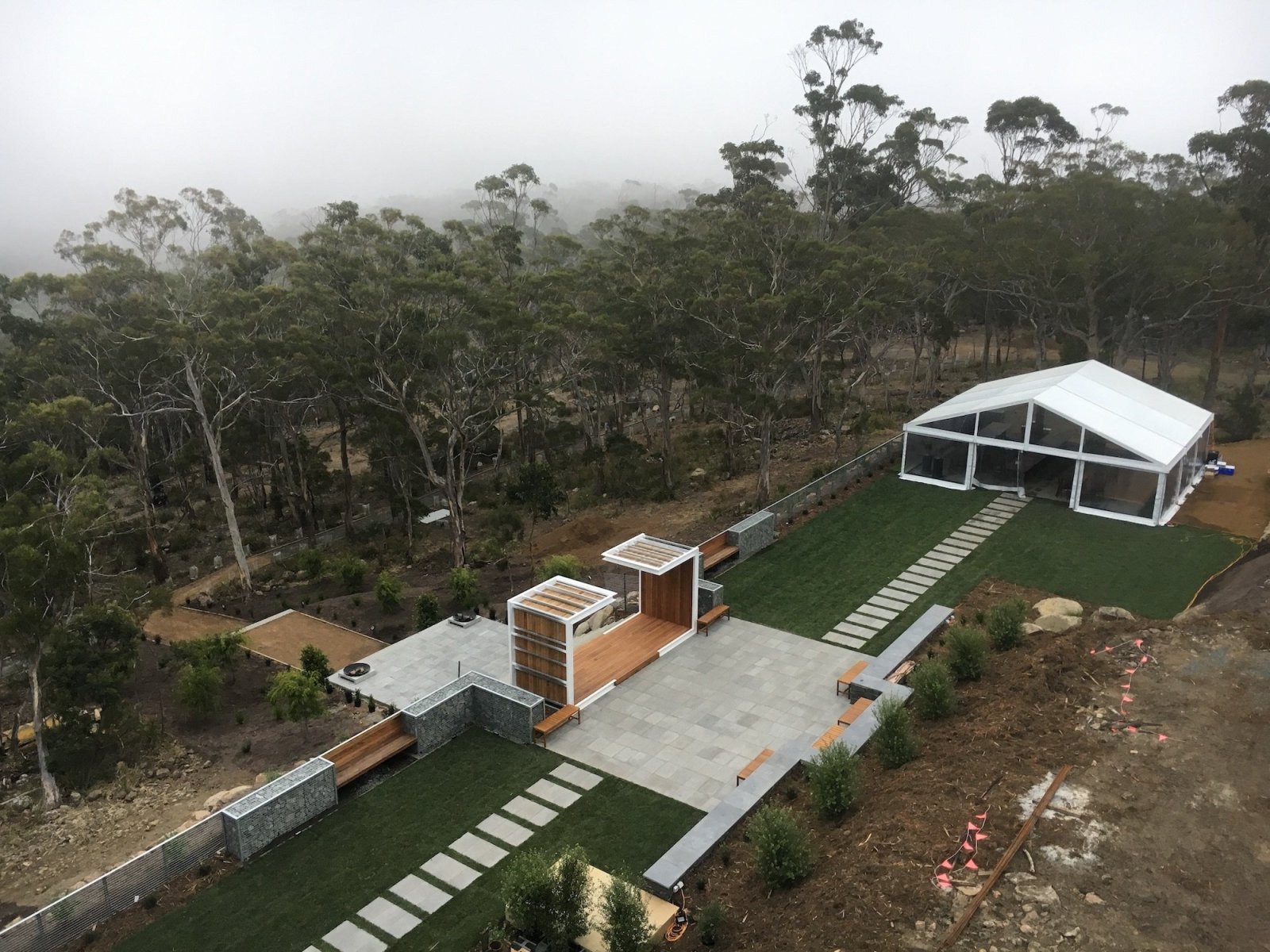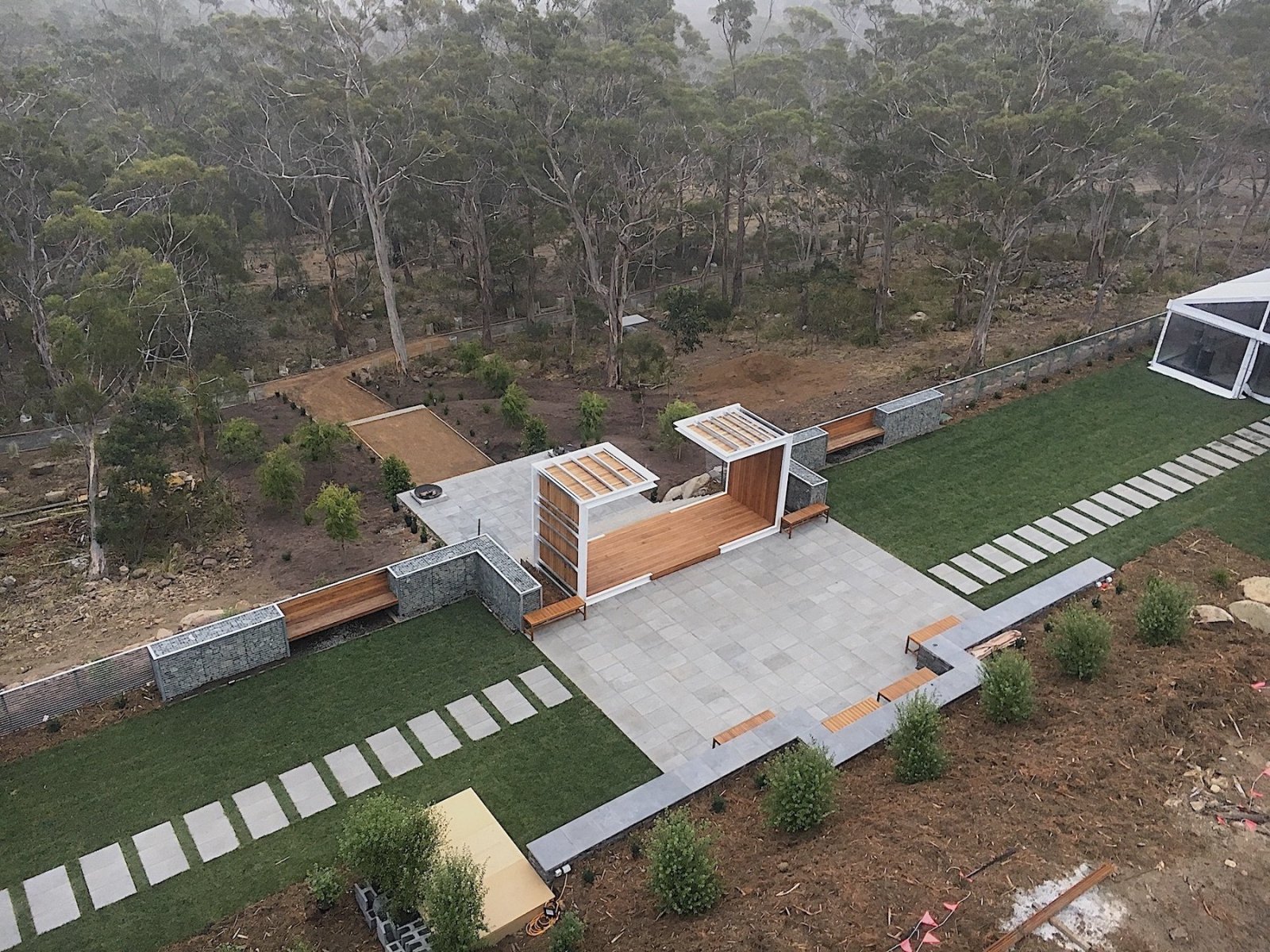 The architectural theme of this wedding venue, overlooking kunanyi / Mt Wellington, relies on a strong modular linearity. The reception and accommodation units are constructed using recycled shipping containers. Extending out of the central reception building, the lawn perimeter is defined by gabion wall modules and mesh fencing punctuated with spotted gum timber seats. Three flights of concrete stairs connect the paved levels and lead the eye from the highly formal upper components down into the unspoilt bushland with gravel paths below. A high degree of technical precision was required to achieve the desired grandeur and formality.