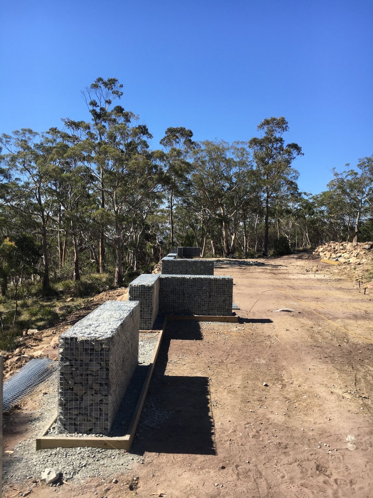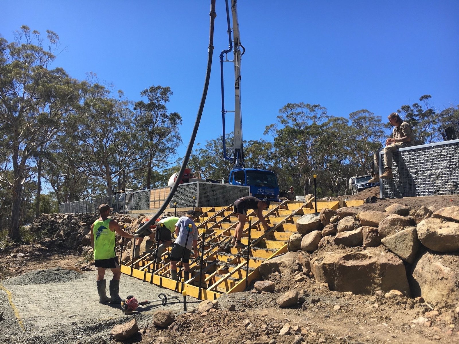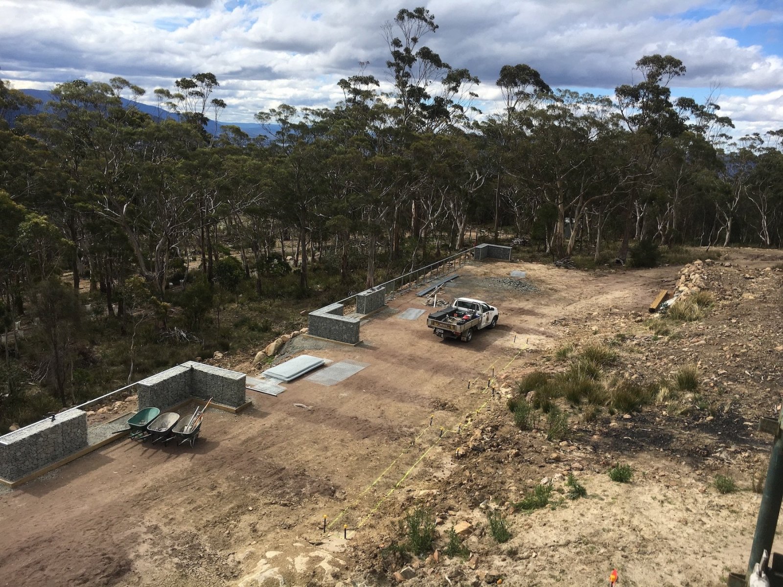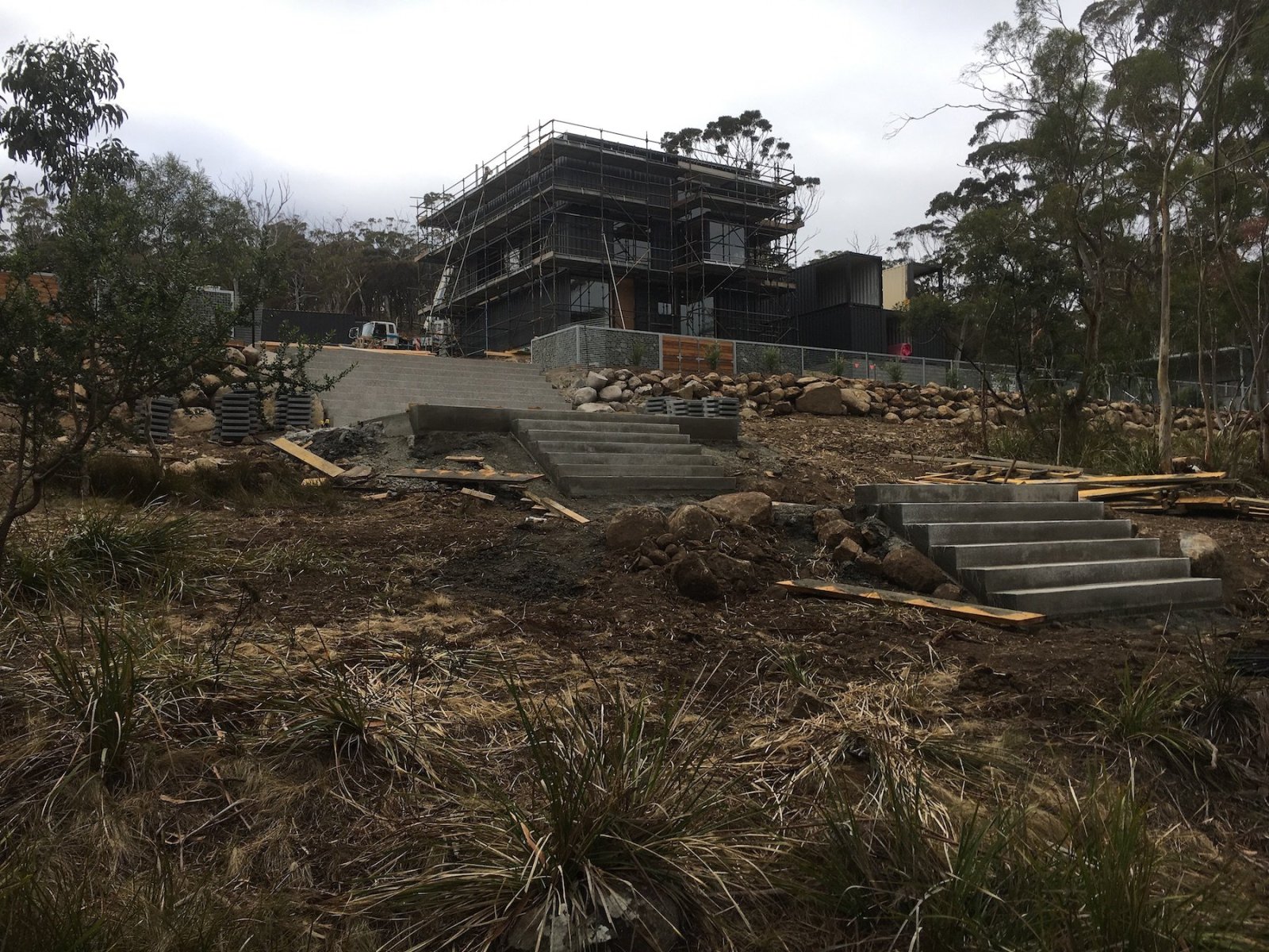 The architectural theme of this wedding venue, overlooking kunanyi / Mt Wellington, relies on a strong modular linearity. The reception and accommodation units are constructed using recycled shipping containers. Extending out of the central reception building, the lawn perimeter is defined by gabion wall modules and mesh fencing punctuated with spotted gum timber seats. Three flights of concrete stairs connect the paved levels and lead the eye from the highly formal upper components down into the unspoilt bushland with gravel paths below. A high degree of technical precision was required to achieve the desired grandeur and formality.