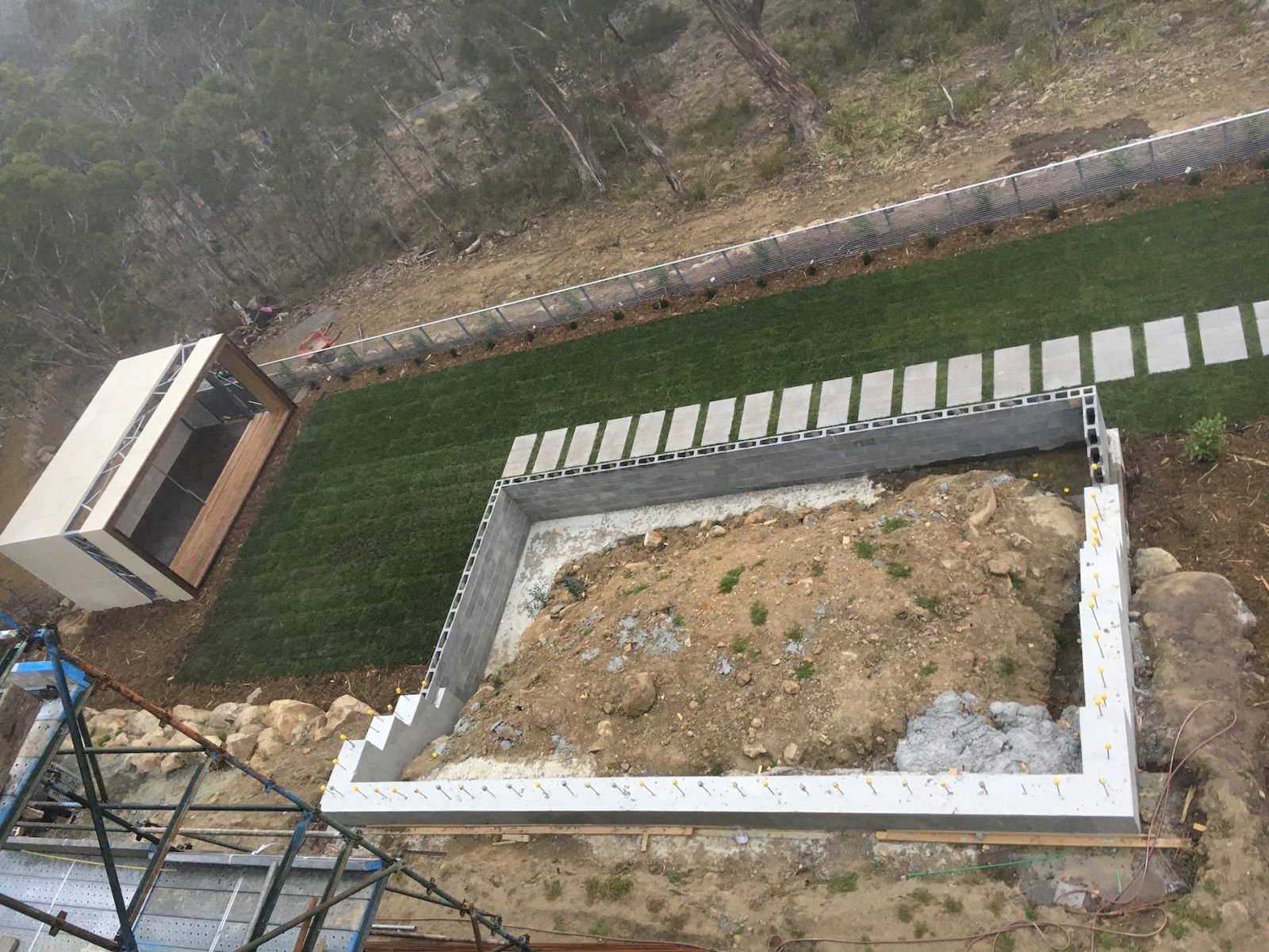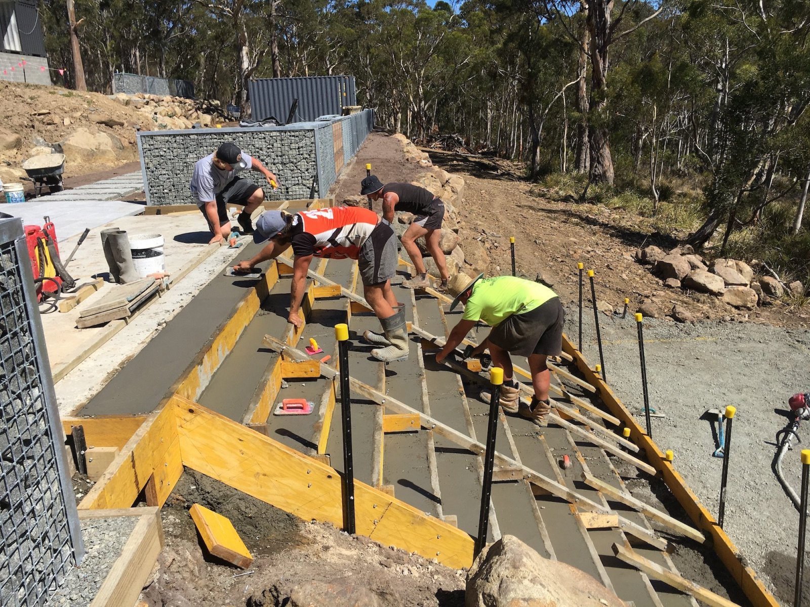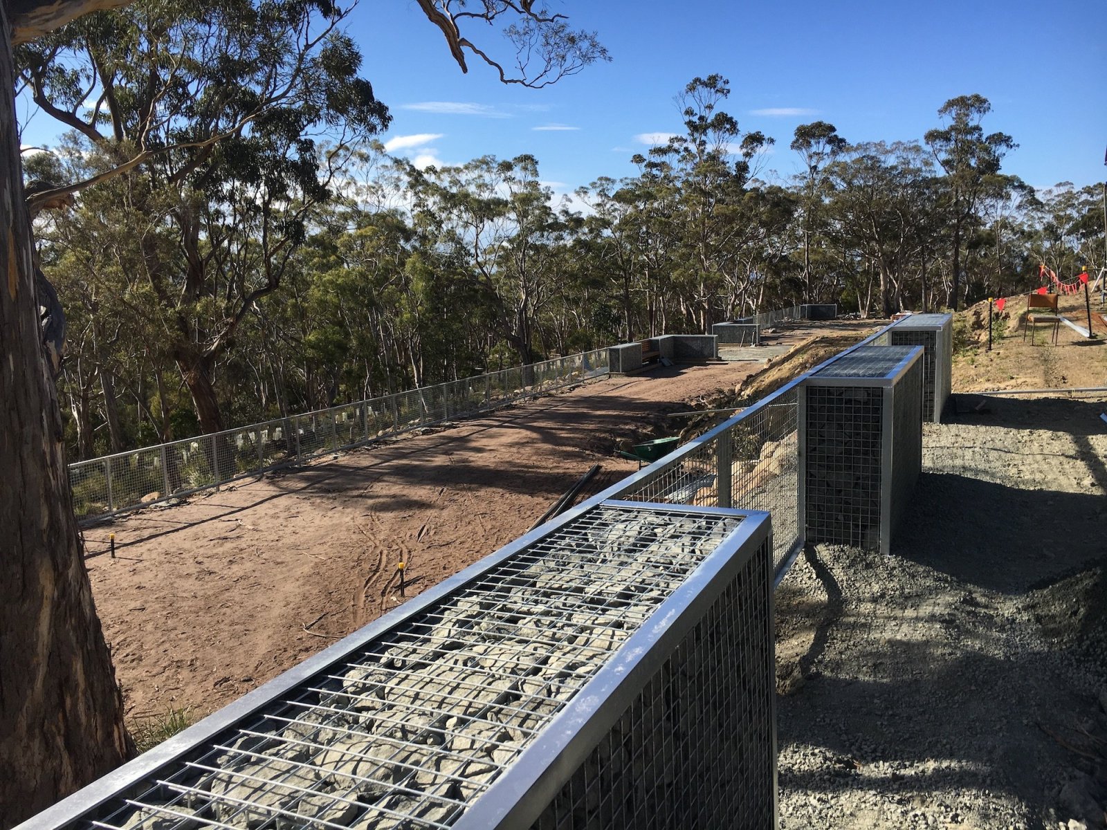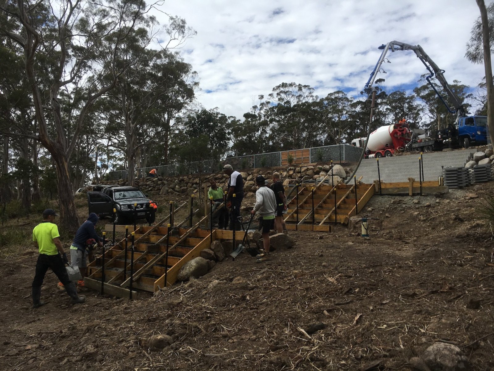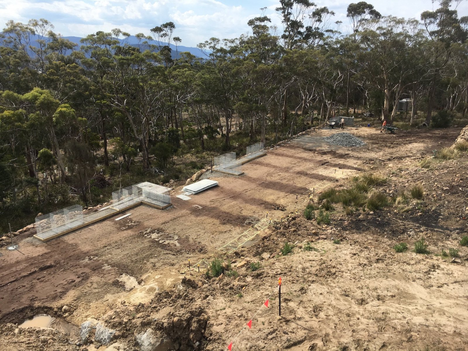 The architectural theme of this wedding venue, overlooking kunanyi / Mt Wellington, relies on a strong modular linearity. The reception and accommodation units are constructed using recycled shipping containers. Extending out of the central reception building, the lawn perimeter is defined by gabion wall modules and mesh fencing punctuated with spotted gum timber seats. Three flights of concrete stairs connect the paved levels and lead the eye from the highly formal upper components down into the unspoilt bushland with gravel paths below. A high degree of technical precision was required to achieve the desired grandeur and formality.