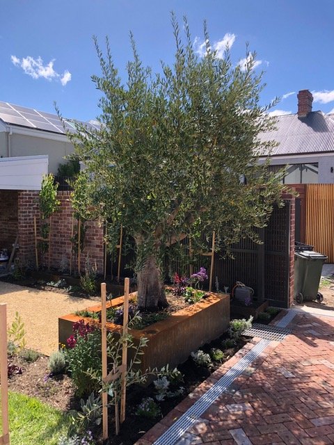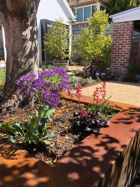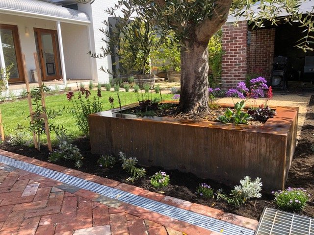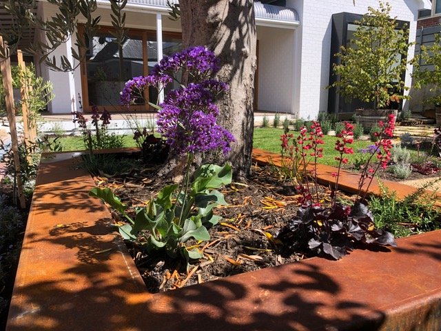 The formal elements in this garden - flagstone sandstone paving, corten steel raised planter beds, old Hobart red bricks, wine barrels - serve as a stage from which the real botanical stars of the show, can sing and shine.